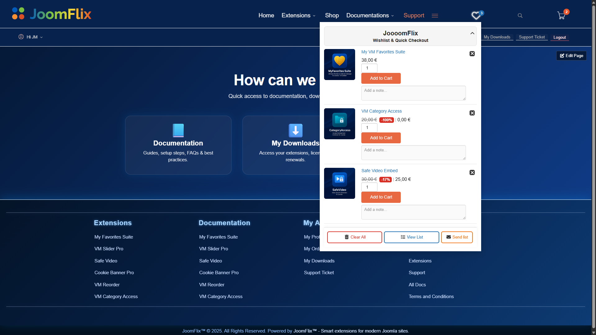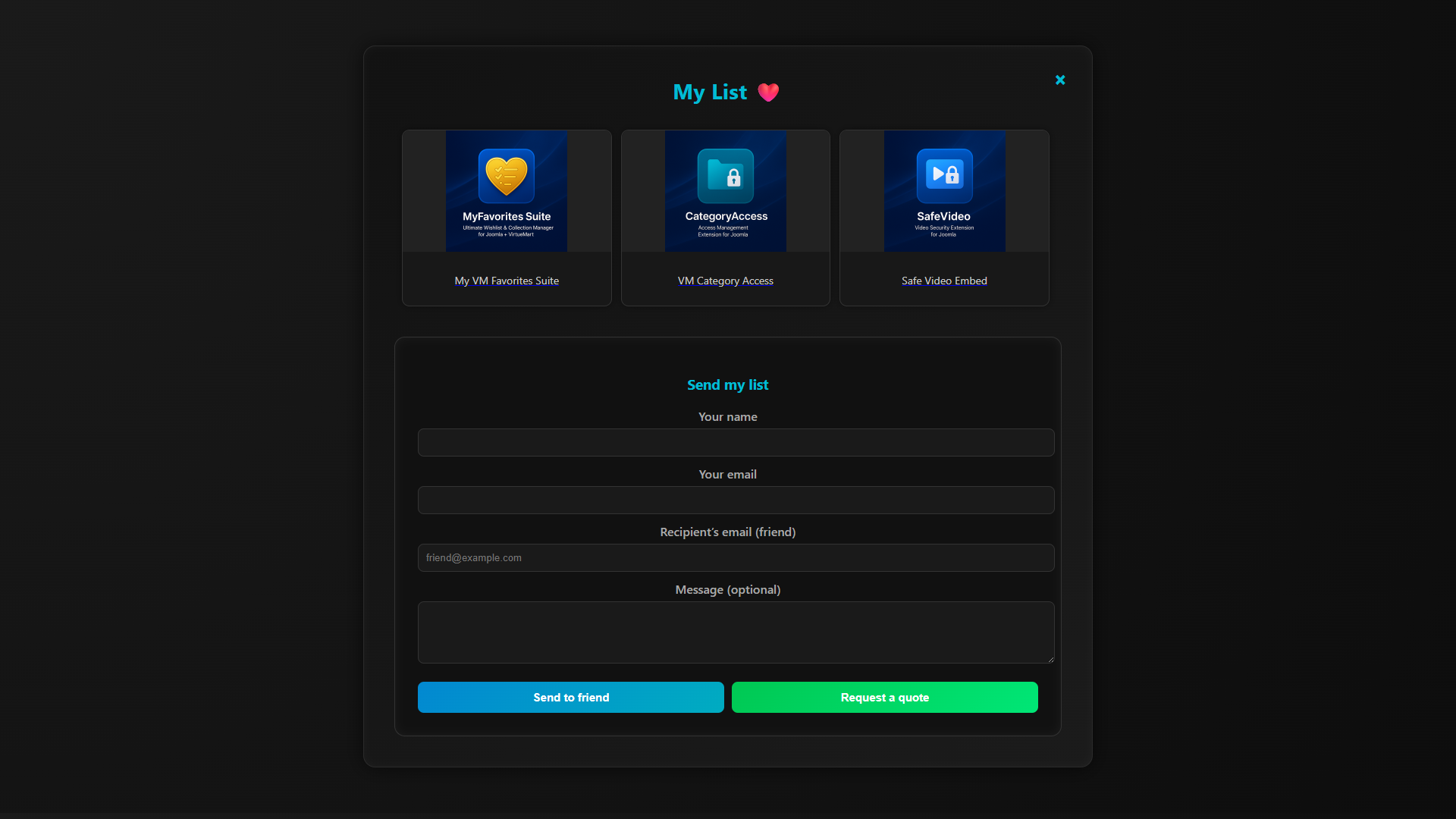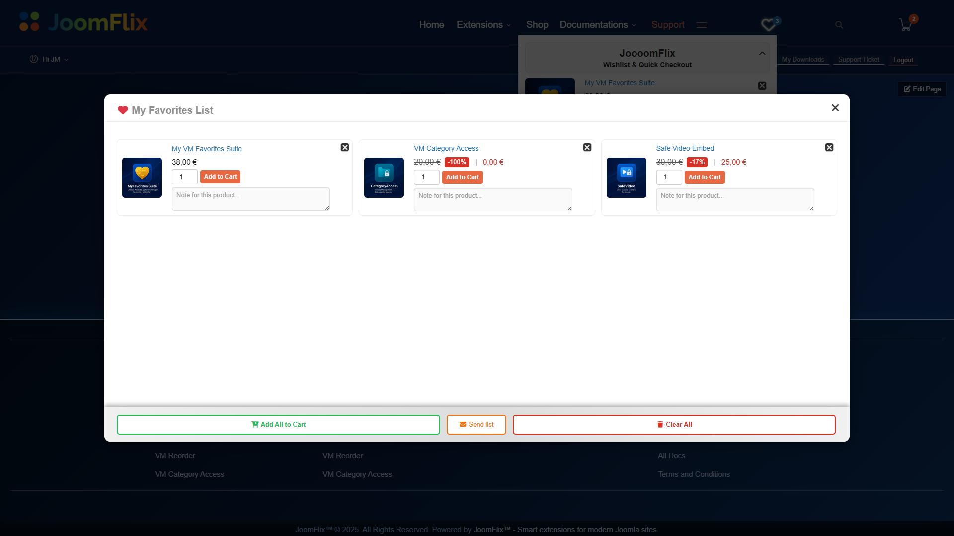 MyFavorites Suite is a complete product-saving ecosystem for VirtueMart 4 and Joomla 5, built with modern UI, AJAX interactions, and a powerful modal manager. It delivers a smooth, elegant and highly optimized user experience for both B2C and B2B stores.