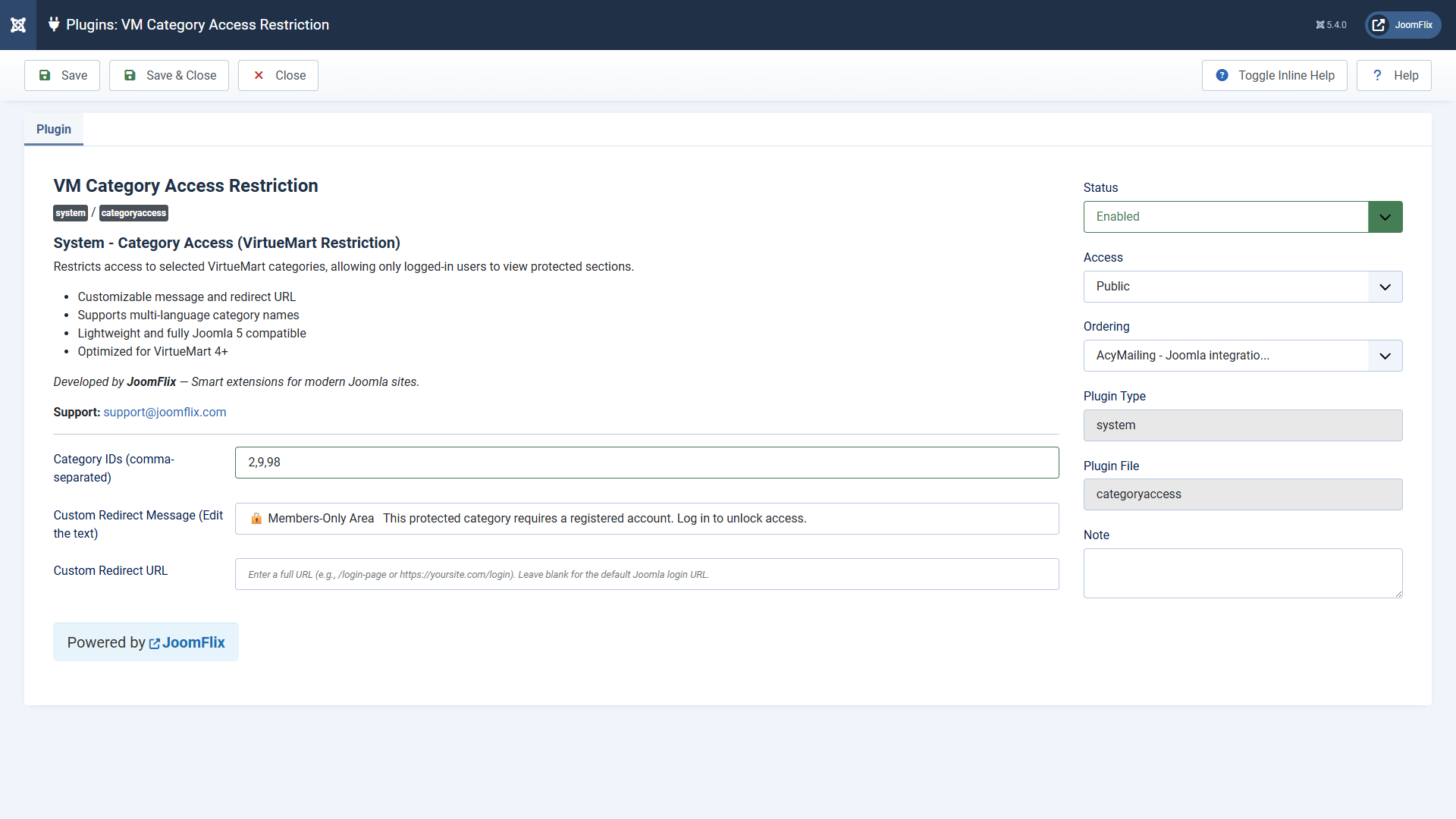 Official documentation for JoomFlix VM Category Access — category restriction rules, guest vs registered access, redirects and configuration inside Joomla 5 & VirtueMart.